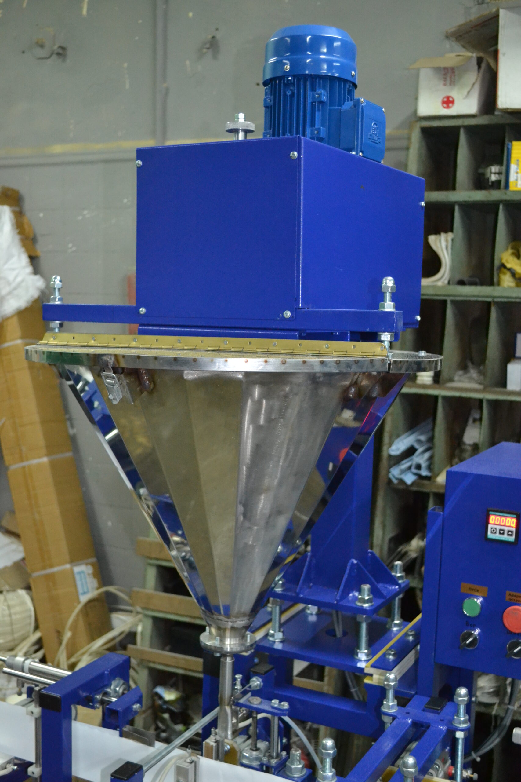 When a signal is sent from the dispenser controller located in the control unit, the electric drive begins to rotate the auger, thereby moving the product from the storage bin down the tube. The product is dosed at two speeds (coarse and fine), set on the controller. The speed of rotation of the auger is determined by the values set on the frequency converter. Additionally, at the customer’s request, an agitator can be installed to improve the pouring of the product to the neck of the bin. Using a special unit, the pre-formed sachet package opens, and the auger dispenser tube is lowered into the package to fill it with a dose of product. After filling the sachet package, the control unit gives a command to lift the dispenser tube and seal the last seam of the sachet package.